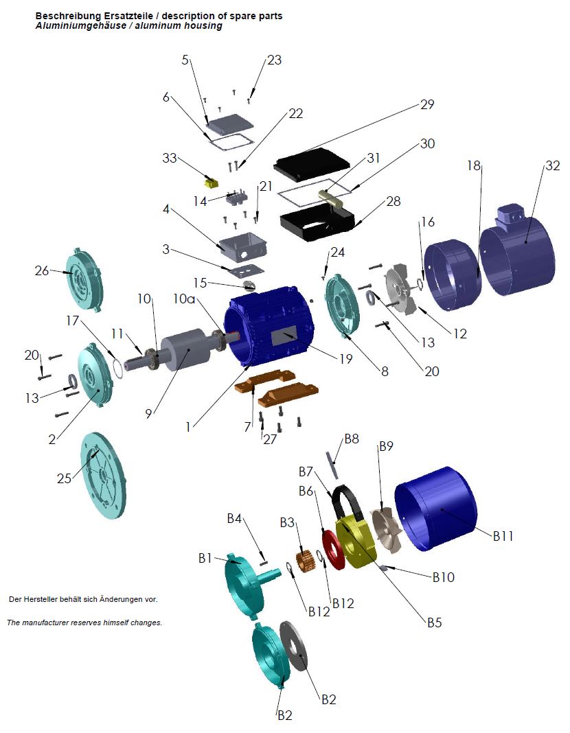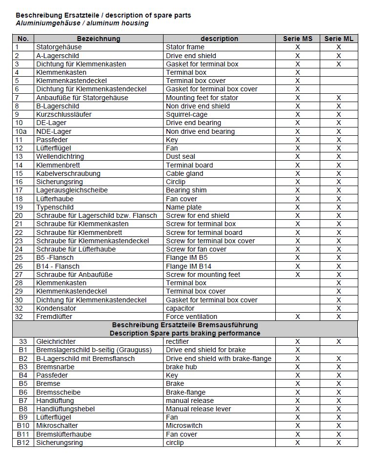 Części zamienne do silników elektrycznych / silników hamulcowych wykonanych z aluminium są oczywiście dostępne. Ponieważ nie są one wymienione w całości w sklepie internetowym, prosimy zamawiać je przez e-mail. Widok rozstrzelony z przeglądem części zamiennych jest bardzo pomocny w znalezieniu odpowiedniego oznaczenia artykułu. Informacje te można również znaleźć w odpowiednich instrukcjach obsługi.
