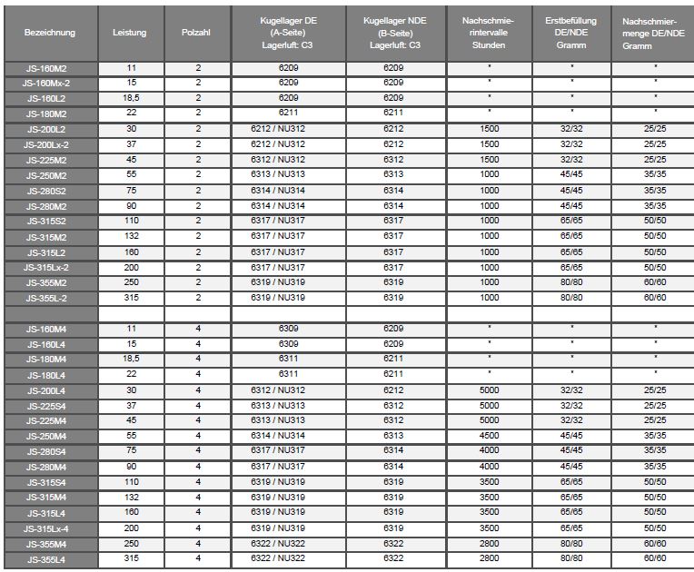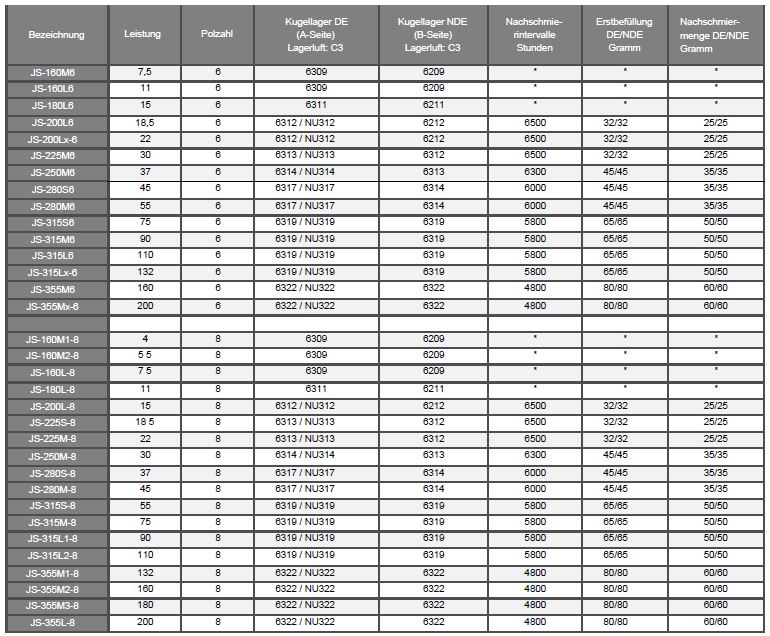 Wzmocnione łożyska są stosowane w silnikach elektrycznych, gdy siły boczne na wale silnika są zbyt duże. Ma to często miejsce w przypadku większych silników od rozmiaru 200 wzwyż, jeśli moc mechaniczna jest przenoszona za pomocą pasków klinowych. Wzmocnienie łożyska jest konieczne tylko po stronie wału (strona A) silnika. W poniższej tabeli znajdą Państwo listę typów silników, w których możliwy jest montaż wzmocnionego łożyska (łożysko NU). Jeśli wzmocnienie łożyska jest wymagane w przypadku mniejszych napędów, prosimy skontaktować się z nami w celu przeprowadzenia kontroli technicznej.